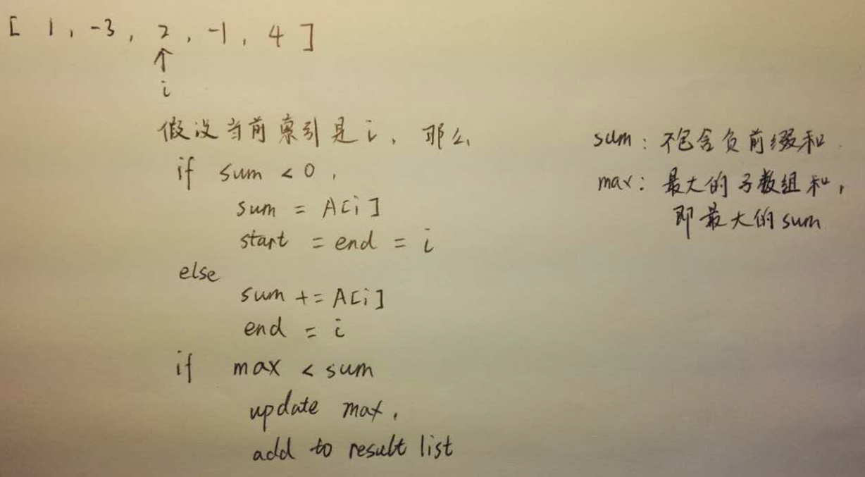 - 每当遍历数组, 当前前缀和减去它之前的最小的前缀和, 然后取最大的sum, 便是答案